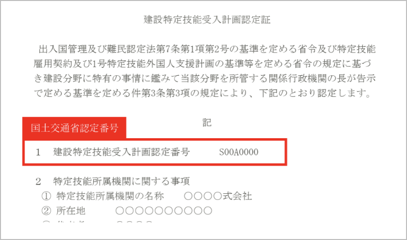 国土交通省が発行する「建設特定技能受入計画認定証」に記載されている、8桁の番号です。